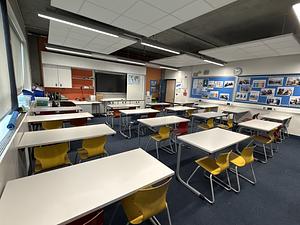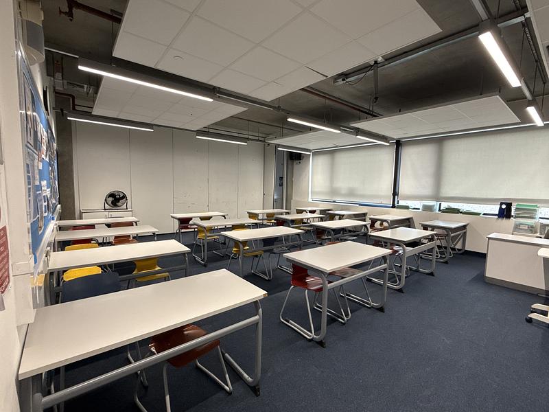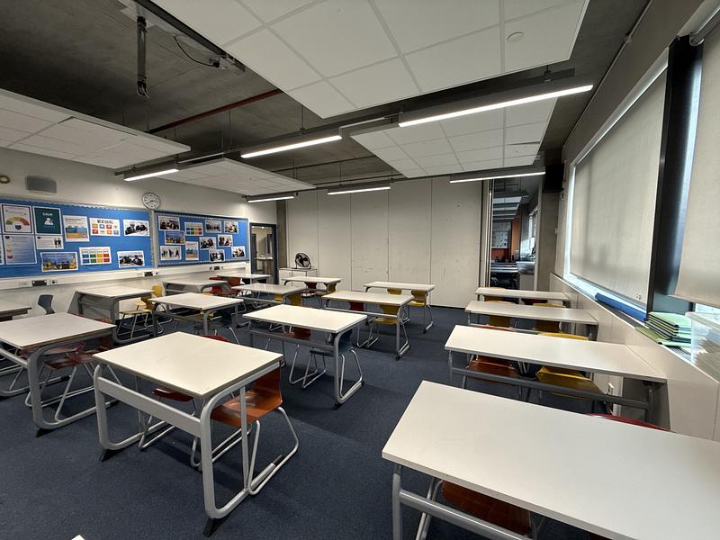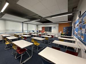 Our classroom at Ark Walworth Academy offers a conducive environment for growth and engagement. Featuring full-size desks and chairs, this spacious room comfortably accommodates up to 30 individuals. Whether you're hosting lectures, seminars, or workshops, our well-equipped facility ensures every participant has the space they need to focus and thrive. With ample natural light and an open atmosphere, it's an ideal setting. Complete with foldable wall, it can be expanded by joining up with C141