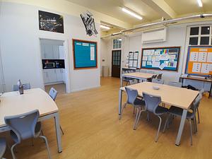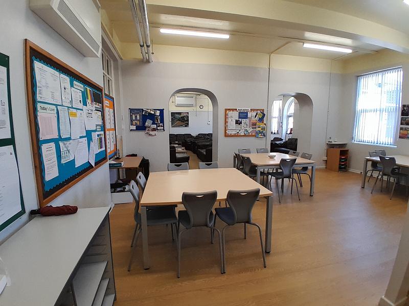 Soft seating and decor for private use and relaxation, includes a kettle, toaster and microwave.