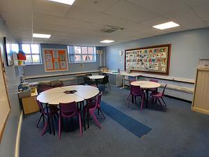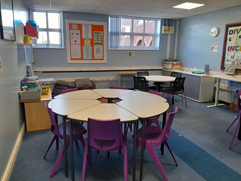 A small room with soft seating, bean bags and a table. Perfect for small breakouts or 121 tuition