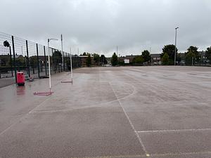Tarmac or rubberised outdoor play area with ball-retaining fence and sports markings on the ground - 4 Netball Court Markings