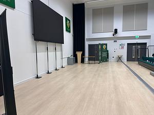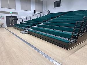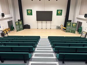 Tiered seating on two sides with large presentation screen and sound system