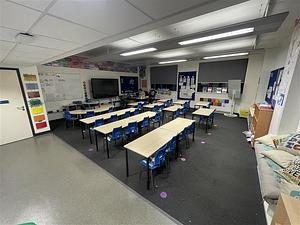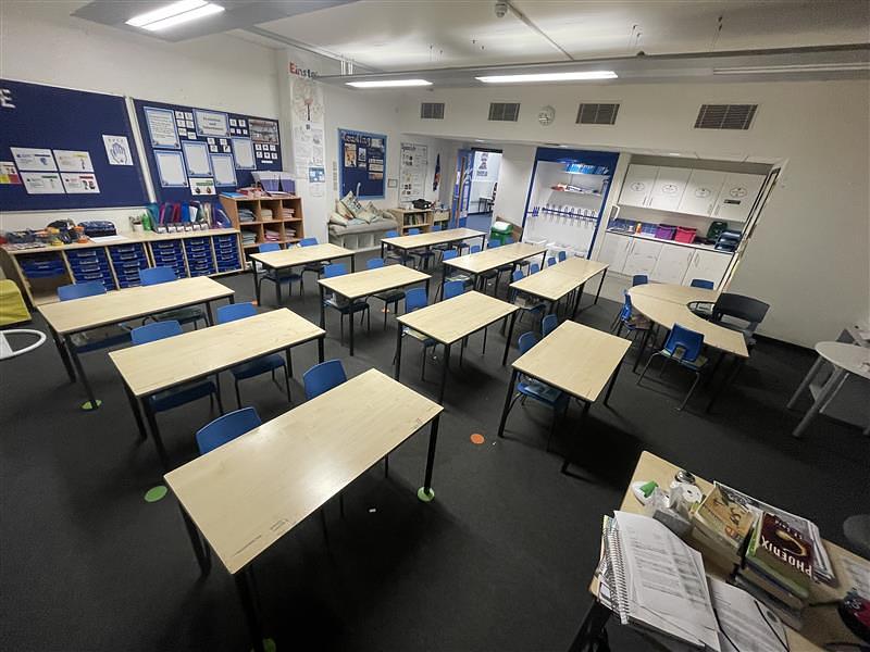 Reduced size school desks and chairs, school decor with a touch screen