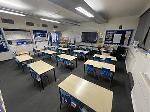 Reduced size school desks and chairs, school decor with a touch screen