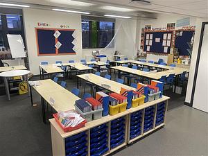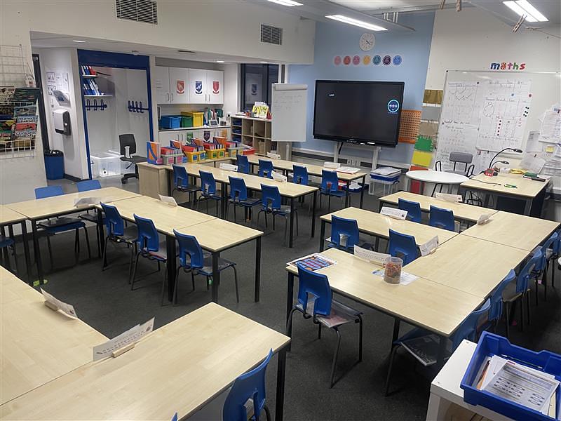 Reduced size school desks and chairs, school decor with a touch screen