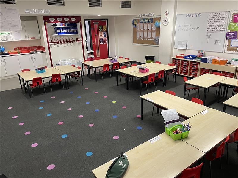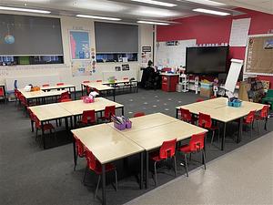 Reduced size school desks and chairs, school decor with a touch screen and chairs