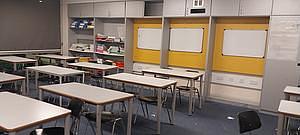 Full-size school desks and chairs in a range of Classrooms, available in various parts of the school.