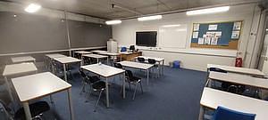 Full-size school desks and chairs in a range of Classrooms, available in various parts of the school.